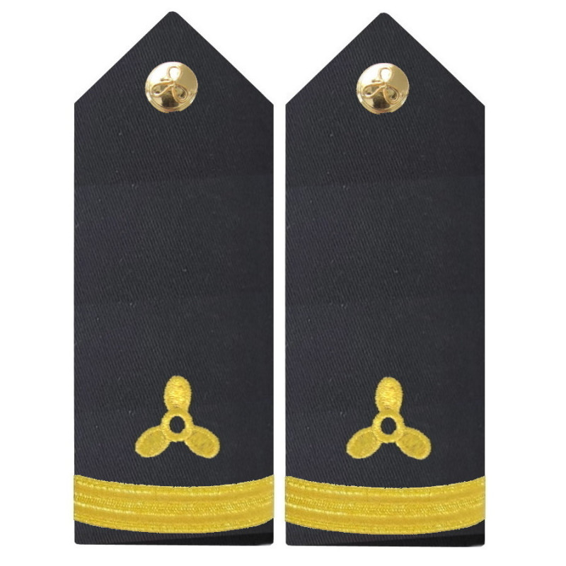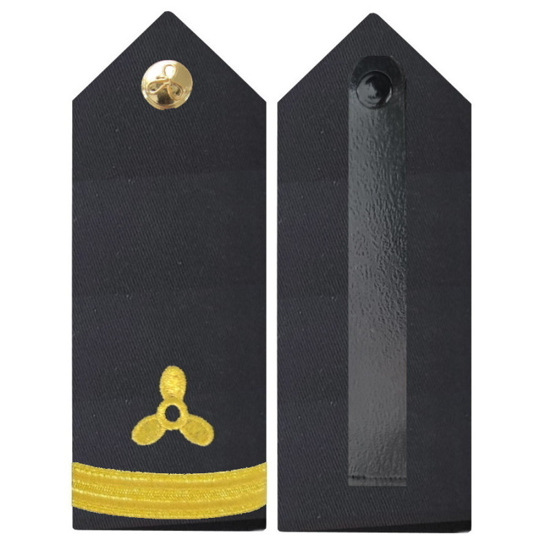 Snap on strap back hardboard shoulder board epaulets with a gold propeller button and one gold bar suitable for a merchant marine, boating & yachting engineer uniform. Stiff hardboard shoulder boards are 5 1/2 inches long by 2 1/4 inch width. All stiff hardboard shoulder boards are constructed using durable black 60/40 cloth and are specially designed to fit onto shirts and jackets that feature shoulder loops instead of button down epaulets. Offered as a set of two.